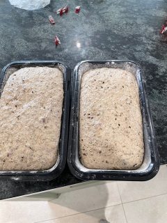 Remove from bowl and use dough scraper to shape as if Pre-shaping. Get it as tight as you can and lower into the greased and floured tins (for vegan use coconut oil and flour). Cover and leave on the side in the kitchen. Day 110.00pm